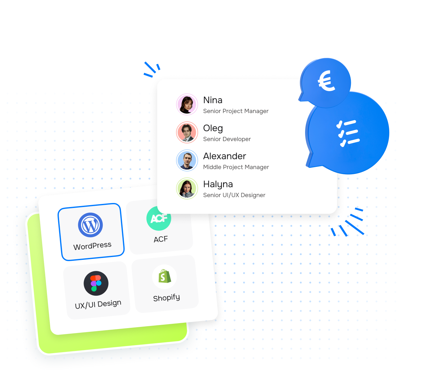 Simply choose the required tech stack and workload. No salary costs, no long-term commitments.